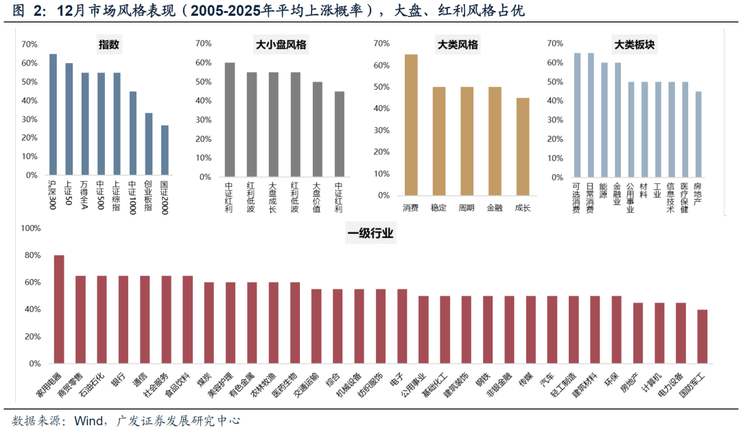 12月:过去20年,指数在12月涨跌各半,不过基本面定价的有效性较11月增强;风格方面,大盘优于小盘,红利占优,金融板块涨幅居前,港股红利也迎来一年中日历效应最强的时段。