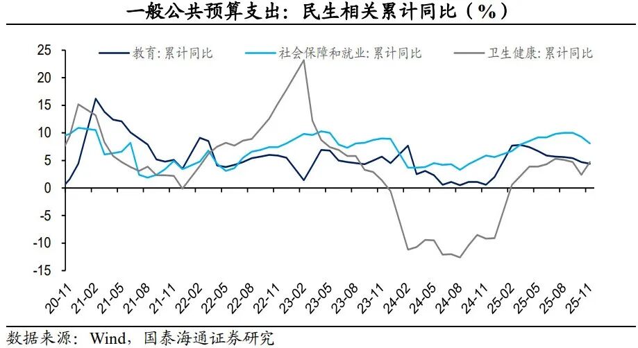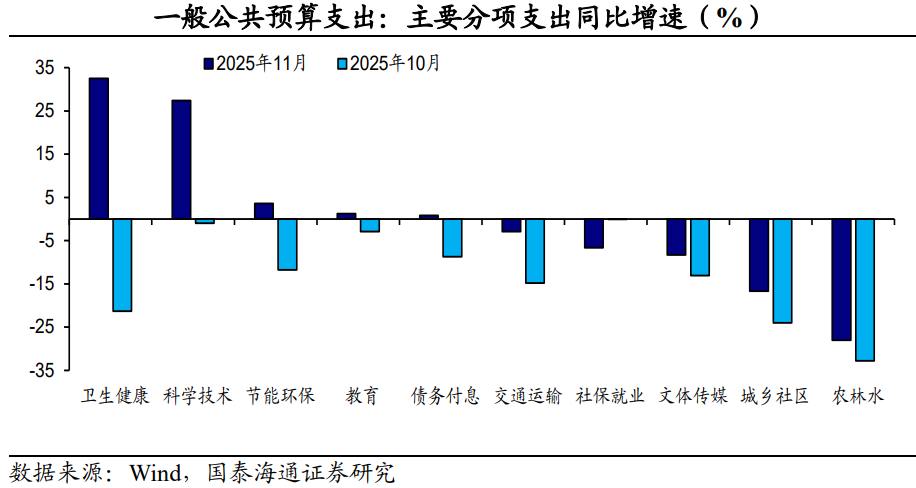 狭义支出:降幅收窄,有保有压。2025年1-11月,全国一般公共预算支出同比增长1.4%。其中,11月当月同比增速-3.7%,相比10月增速-9.8%,降幅边际收窄。不过,在去年同期低基数的情况下,本月整体财政支出增速仍处于低位。这可能与年内财政发力“前置”,以及年末根据实际进行预算调整有关。从分项看,2025年11月当月,卫生健康、科技、节能环保等领域的支出增速领先,但与去年同期低基数有关。同时,社保就业、城乡社区、农林水等支出负增。