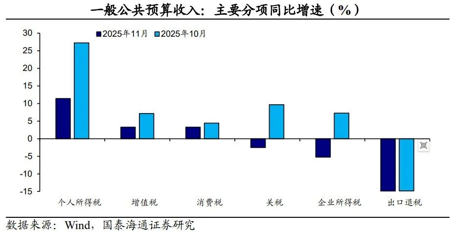 税收收入增速回落。2025年1-11月,全国税收收入同比增长1.8%。11月当月同比增速2.8%,相比10月的8.6%边际下滑,主要与基数抬升有关。即便如此,个人所得税、增值税收入仍有不错表现。不过,企业所得税收入受到较大扰动,同比增速转负。此外,在低基数下,消费税收入增速有所回落,出口退税收入降幅明显。考虑到下半年房地产需求调整,经济增长的内生动能还需增强,宏观积极政策仍需加码。
