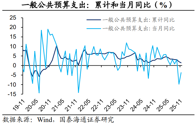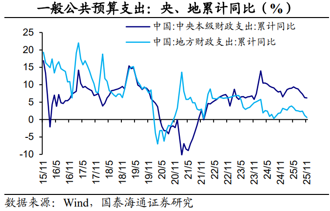 狭义支出同比降幅收窄。2025年1-11月,全国一般公共预算支出同比增长1.4%。其中,11月当月同比增速-3.7%,相比10月增速-9.8%,降幅边际收窄。值得关注的是,11月央、地财政支出同比增速分别为4.9%、-5.1%,前者在基数抬升的情况下仍然回升,后者降幅也有所收窄。不过,在去年同期低基数的情况下,本月整体财政支出增速处于低位。这可能与年内财政发力“前置”,以及年末根据实际进行预算调整有关。