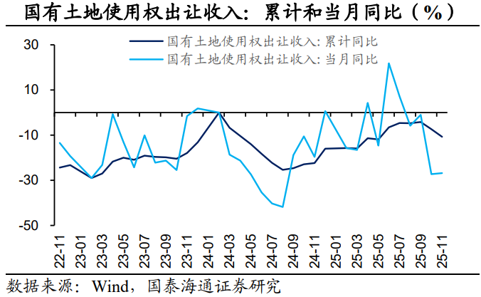 政府性基金收入低位运行,主因房地产市场调整。2025年1-11月,全国政府性基金预算收入同比下降4.9%。其中,11月当月同比增速-15.8%,连续两个月降幅较为明显。究其原因,过去几个月,房地产市场调整加速。11月当月,国有土地使用权出让收入同比增速-26.8%。