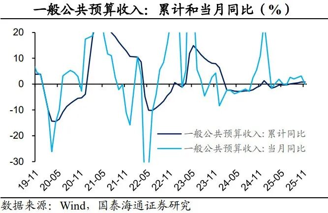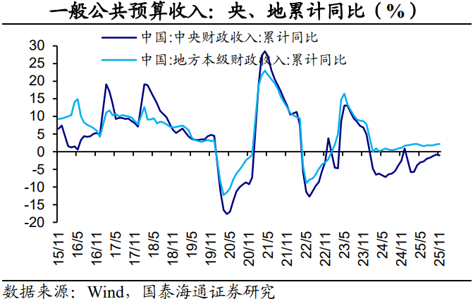 狭义预算收入增速边际回落。2025年1-11月,全国一般公共预算收入同比增长0.8%。其中,11月当月收入持平于2024年同期,同比增速相比10月的3.2%边际回落。值得关注的是,11月央、地财政收入同比增速分别为-4.2%、4.1%,前者的回落与较高基数有关,而后者在基数抬升的情况下仍有不错表现。不过,本月狭义预算收入增速创下半年新低。接下来,内需的修复是财政收入改善的关键。