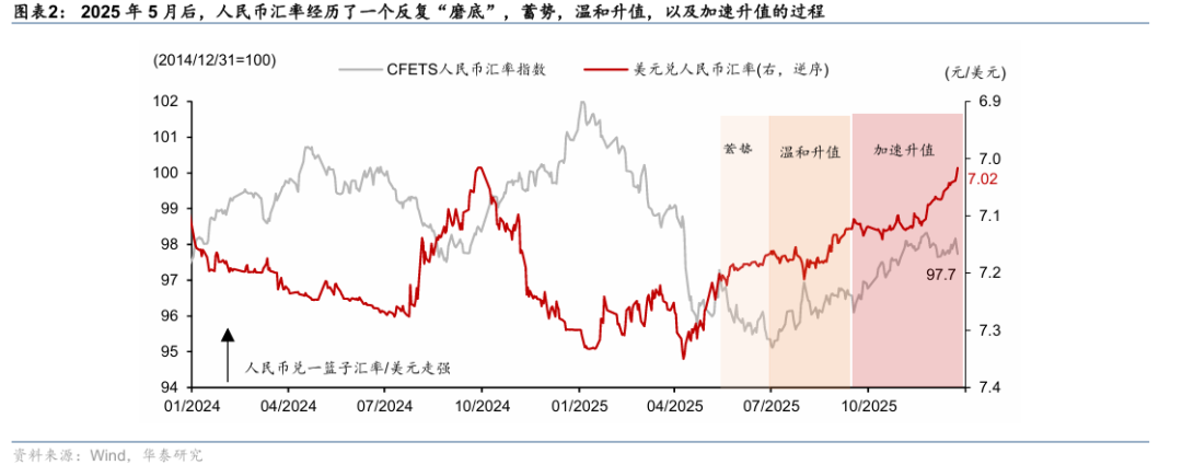 直至2025年5月后,人民币才走出较为持续的升值行情,且这一趋势的逆转经历了一个反复“磨底”,蓄势,温和升值,以及加速升值的过程(图表2),最终走出了较为持续和更有“确定性”的升值趋势,我们在此前的一系列报告中也持续跟踪了这一历程。