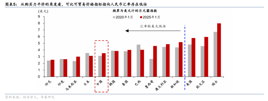 2022年4月至今年6月,人民币实际有效汇率累计回调19%,为1990年以来最大的一轮调整周期,同时,中国企业的成本优势在过去几年与海外继续拉开“身位”。近年来,中国制造业、出口、贸易顺差的绝对值和全球占比均节节攀升。从购买力平价的角度看,多项可比可贸易价格指标均指向人民币汇率存在低估(图表5)。2020年来,美元计价中国PPI累计涨幅比美国低39个百分点、比欧洲低49个百分点。仅2025年,估计中国GDP平减指数涨幅低于美国约2.5-3个百分点,PPI涨幅低于美国4.5-5个百分点(图表6和7)——也就是说,动态地看,年化4-5个百分点的升值完全无损中国出口行业的总体优势。