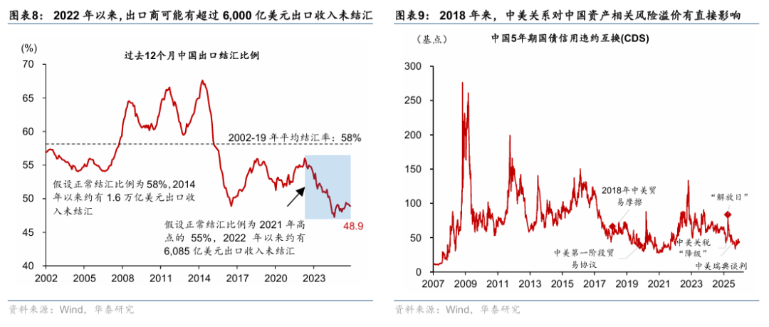 同时,我们重申中国企业与金融机构长期偏好配置海外资产,随着人民币汇率风险调整后的预期更为“中性”,跨境资本回流潜力巨大。美元作为全球储备货币,在全球化加速时代享有较高的估值溢价和超额配置。1990年以来,中国对美货物贸易顺差累计超过7万亿美元,形成大规模海外资产。2015年后,中国出口结汇比例大幅下降,中国出口商大幅超额“配置”美元资产。即便按照2021年底55%的结汇比例来估算,2022年以来出口商便有超过6,000亿美元出口收入未结汇,显示跨境资本存在进一步流入的空间(图表8)。