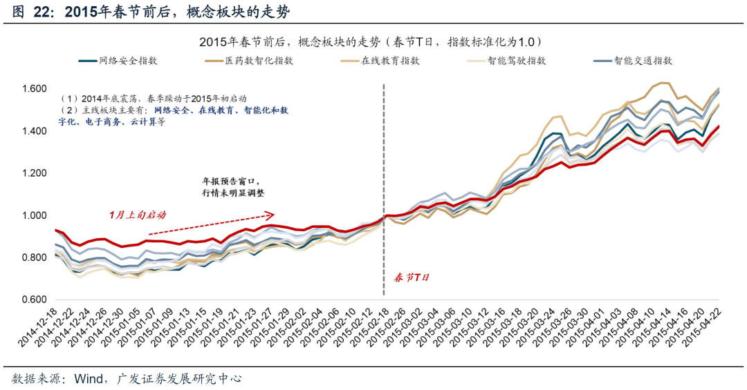2015年“春季躁动” :1月上旬启动、年报预告窗口无调整。2015年“春季躁动” :2014年底震荡,2015年初启动。主线板块主要有:网络安全、在线教育、智能化和数字化、电子商务、云计算等。期间,1月份的年报预告窗口,市场行情并未明显调整。