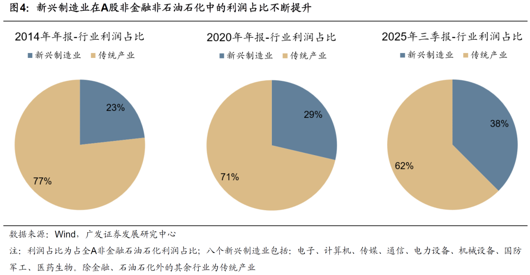 下图清晰地展示了A股非金融非油的利润结构变迁:选取八个典型新兴制造业计算利润占比,权重从14年的23%、提升至20年的29%、再到25年前三季度的38%。除此之外,剩余传统产业的利润占比不断下降,这其中既包括与PPI挂钩的行业、也包括纯内需主导的消费与服务业。