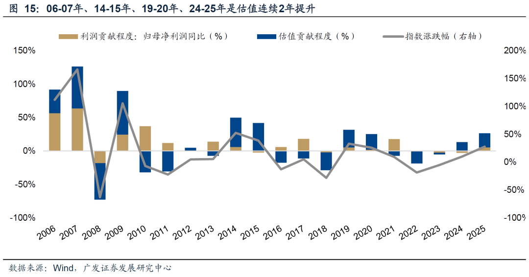 25年末投资者问我们最多的问题之一:A股历史上还没有出现过连续3年“提估值”,在24-25年连续2年估值正贡献的情况下,如何看待26年的估值变化?能否打破历史规律?