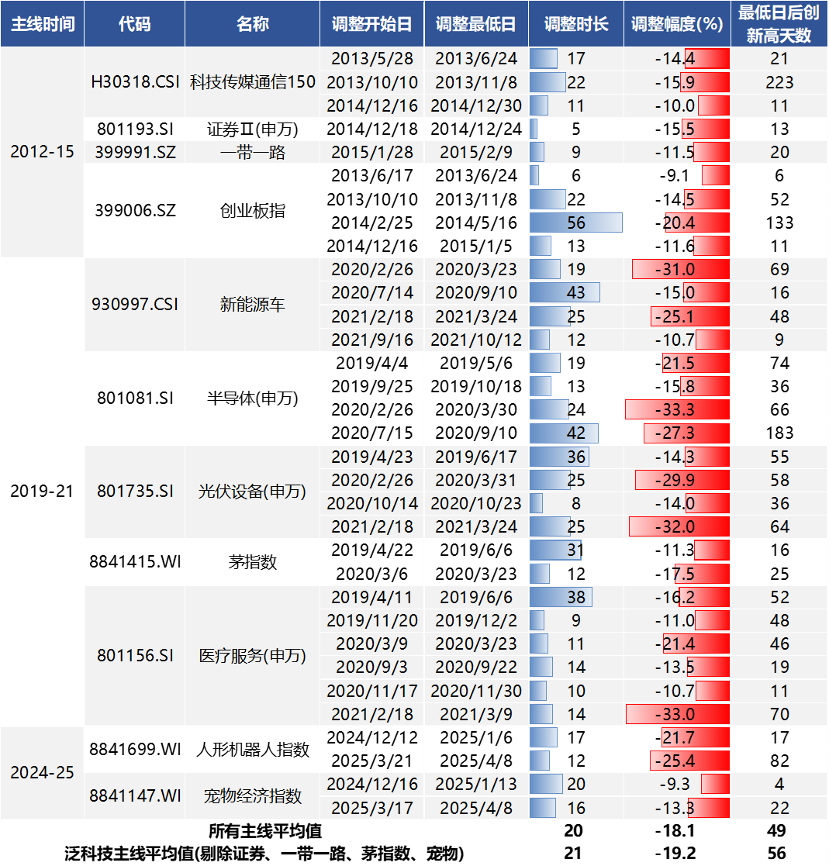 ①历史上的主线行情,大多都会经历“趋势-横盘-趋势延续”的过程;②主线的【均线偏离度】更多决定了行情短期走势,而【产业趋势】是决定主线横盘之后是否会新高的根本;③如果陷入横盘,主线平均调整时长为21个交易日,平均调整幅度为19.2%(从高点到低点)。