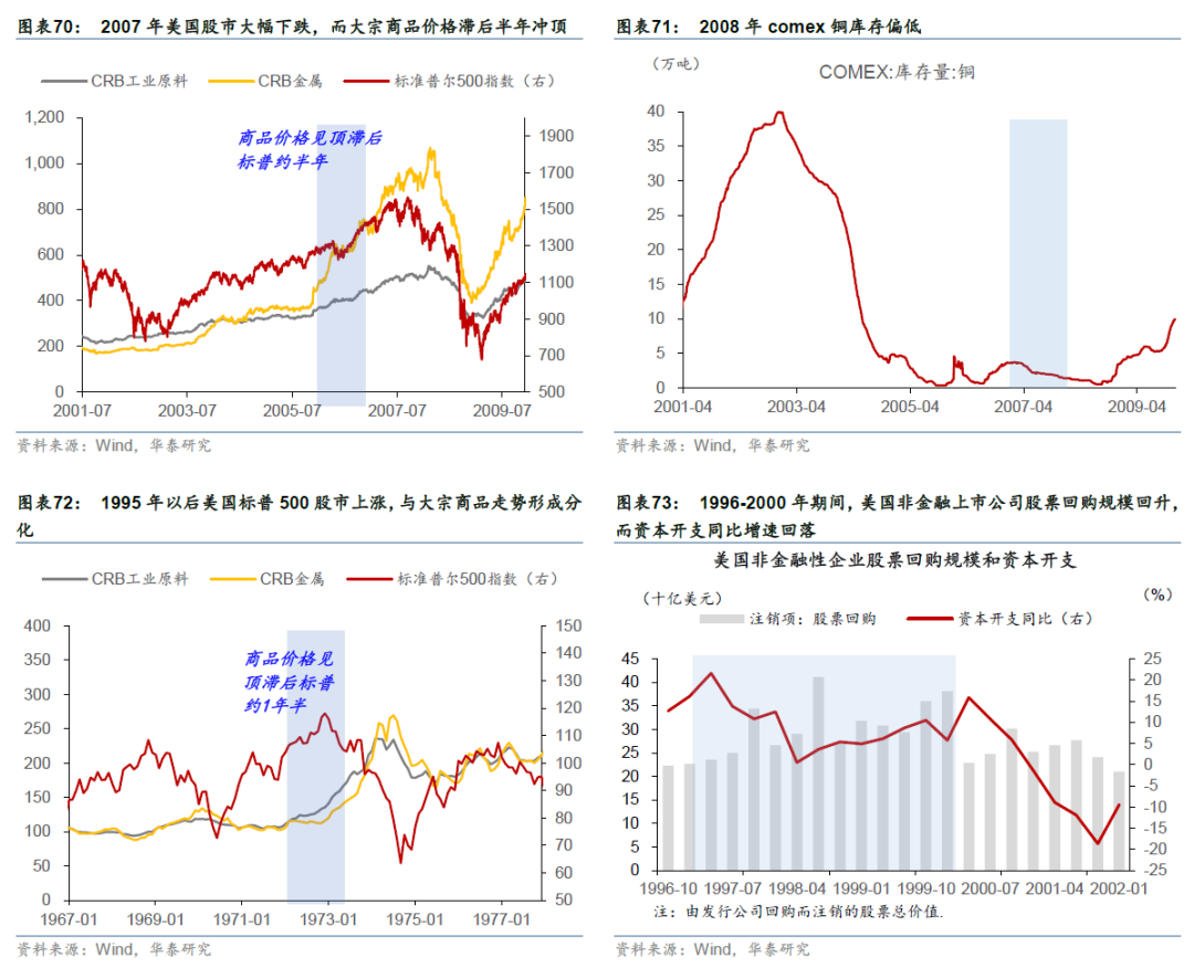 2、2003-2007年的股市及大宗商品价格亦呈现类似特点,中国的城镇化过程伴随大规模的物理建设,需要大量的钢铁、铜、铝、水泥和能源,带动全球大宗商品的需求跳升。叠加全球制造业向中国转移,中国作为“世界工厂”产生了巨大的基建需求,而资源的供应(矿端资本开支)在90年代因长期低价而严重萎缩。商品价格从2003年开始走出长达20年的低谷。而早期的股市上涨(2003-2005)主要得益于全球低利率环境和中国加入WTO带来的全球贸易红利,此时企业利润率因成本尚低、需求增长推动企业实行资本扩张、进一步抬升股市估值。而到了中后期(2006-2007),商品价格的上涨强于名义经济增速,实物资产涨价挤压制造业的利润。2007年随着贝尔斯登旗下的对冲基金倒闭,次贷危机开始由房地产向金融系统传导,基准利率上升和房价下跌,美国股市大幅下跌,而大宗商品价格则在中国城镇化的巨大结构性需求支撑下,在股市下跌的前半年持续冲高。商品价格的上涨或部分受实物库存的影响,经过2002-2007年的长期消耗,全球原油和有色金属库存处于历史极低位,此前企业资本开支对应的实物量需求近期较为刚性,价格对微小的供应扰动极其敏感,铝/铜/原油价格均在标普500指数见顶(2007年10月)后,滞后9个月左右,于2008年7月见顶。