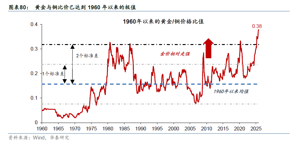 首先,全球财政可持续性持续恶化的背景下,海外通胀中枢可能结构性抬升,全球法币公信力下降,资源品的配置价值抬升。中长期看,法币公信力下降,美元走弱等趋势不变,而随着美国真实利率下降,且全球在右翼势力兴起的背景下货币和财政宽松均可能易松难紧,核心资产的估值可能进一步抬升,黄金及具备黄金属性的核心资产或在全球财政可持续性担忧升温的“货币幻想”背景下,有望继续录得较好表现,且黄金及其他大宗商品(比如铜、原油)比价亦录得1960年以来的极值。