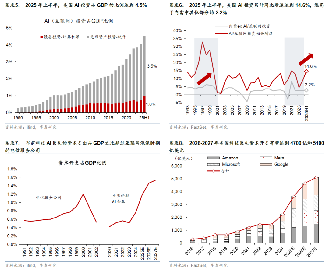 1、对比1996-1999年互联网革命周期,耗材密度及拉动强度较AI投资周期更低。互联网投资通过搭建信息交互平台实现资源优化配置,更多体现为商业模式创新,对固定资产投资的依赖度较低,对GDP的拉动多以间接赋能消费、提升流通效率为主。互联网投资主要拉动普通电子元器件、塑料等基础材料需求,且用量有限,此外其投资主要用于商业模式验证的投入,而非固定资产建设,对原材料需求的拉动较为有限。