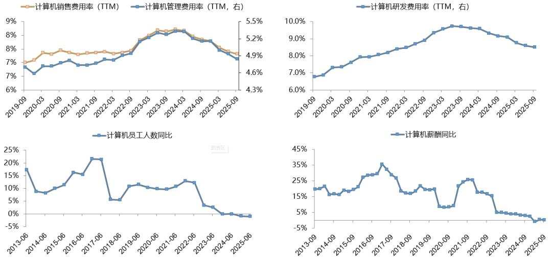 计算机的盈利拐点部分源于前期费用和人员的持续收缩。也是一种程度上的“产能出清”。可以用供给出清+需求改善框架看。截至25Q3,计算机的员工同比负增长、薪酬同比接近负增长(在历史底部)、费用率持续下行。