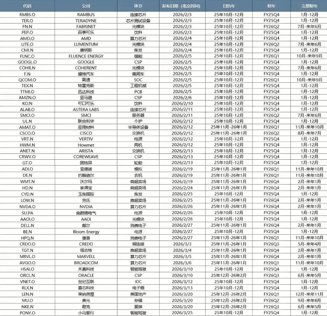 最后,A股年报预告落地,后续步入财报空窗期,而美股财报季刚刚开始。美股财报中透露的海外需求侧冷暖变化、以及对A股的股价映射均值得重视。下表整理后续比较重要的美股公司财报披露日期。