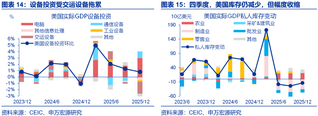 四季度AI投资表现稳健,库存下降幅度收窄,住宅投资边际改善。四季度,美国私人投资对实际GDP增速(环比年化)的拉动达到0.66个百分点,三季度为0.03个百分点,主要拉动力来自于库存变动,其次为住宅投资。1)住宅投资方面,随着美联储降息、特朗普政策改善住房可负担性,2026年美国房地产市场或处于“温和”复苏阶段;2)非住宅投资方面,结构上知识产权投资拉动提升,设备投资有所放缓,后者受交运设备拖累,可能与汽车消费疲软、关税不确定性有关。换句话说,四季度AI相关投资仍然对经济增长形成支撑;3)库存方面,四季度美国私人库存变动拉动经济增速0.21个百分点,较三季度提升0.33个百分点,对应美国私人库存下降幅度收窄。随着2025年前期囤积的库存消耗,美国库存周期有望转向补库。
