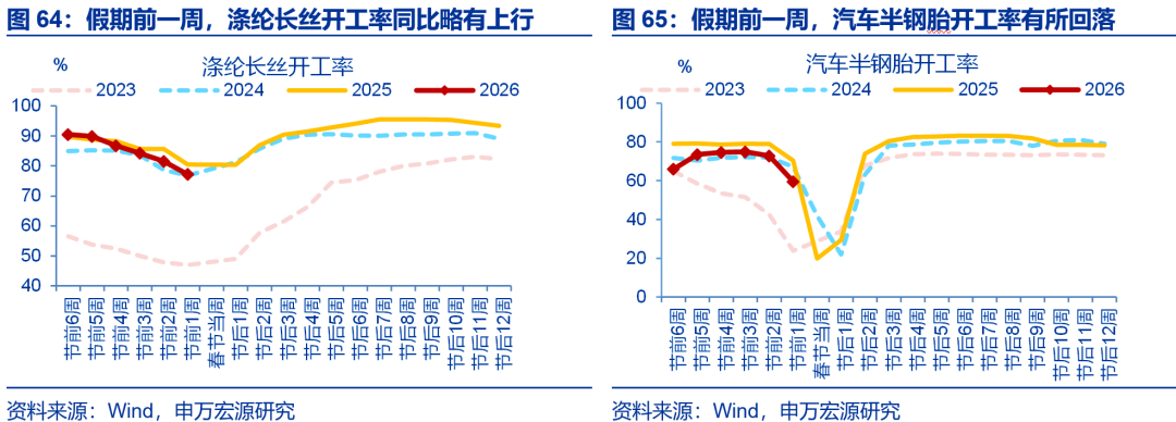 春节假期前,工业生产整体向好,建筑业开工表现分化。春节假期前1周(2月9日至2月15日),工业生产中,高炉开工延续上行(环比0.6%),同比维持在2.2%。石化链开工也有改善,纯碱、涤纶长丝开工同比分别较前周回升1.5、0.9个百分点至-2.2%、-3.3%。相比之下,汽车半钢胎开工率表现较弱,同比回落4.8个百分点至-10.9%。建筑业开工方面,更多反映地产投资的全国粉磨开工率有所走弱,同比回落4.2个百分点至-0.1%;沥青开工率维持韧性,同比维持在1.1%。