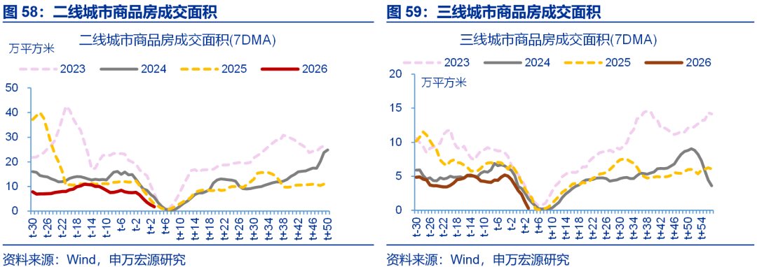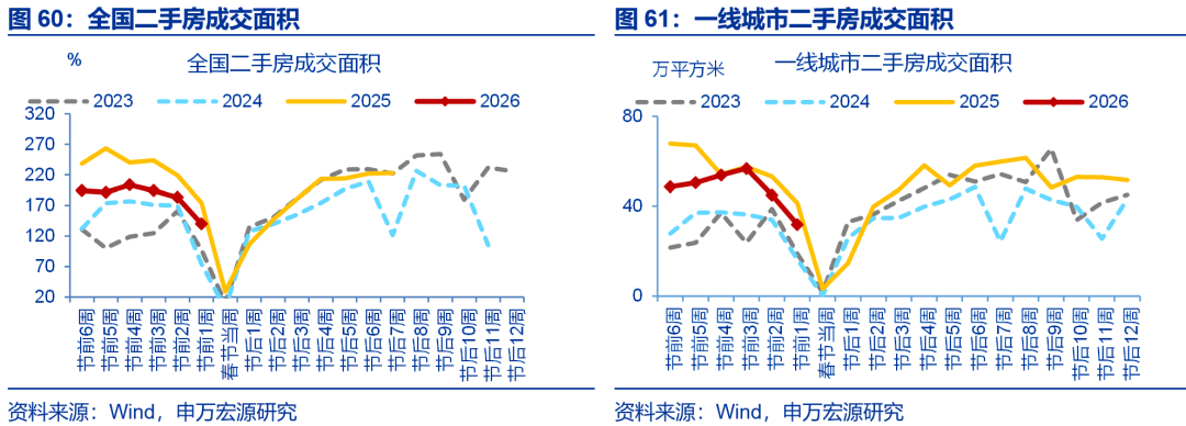 春节假期,全国新房、二手房成交偏弱,结构上一线成交回落幅度较大。假期第1-6日(2月15日至2月20日),30大中城市商品房成交面积合计10.2万平方米,同比-43%、较假期前1周回落10.6个百分点。结构上一线城市商品房成交面积回落幅度较大,同比较假期前1周下行14.7个百分点至-46.8%,二线、三线商品房成交面积回落幅度相对较小,同比分别较假期前1周下行7.4、12.5个百分点至-40%、-45.2%。全国二手房成交面积也有回落,假期前1周同比较假期前2周下行3.6个百分点至-20%;其中一线城市二手房成交面积同比回落7.6个百分点至-22.8%。