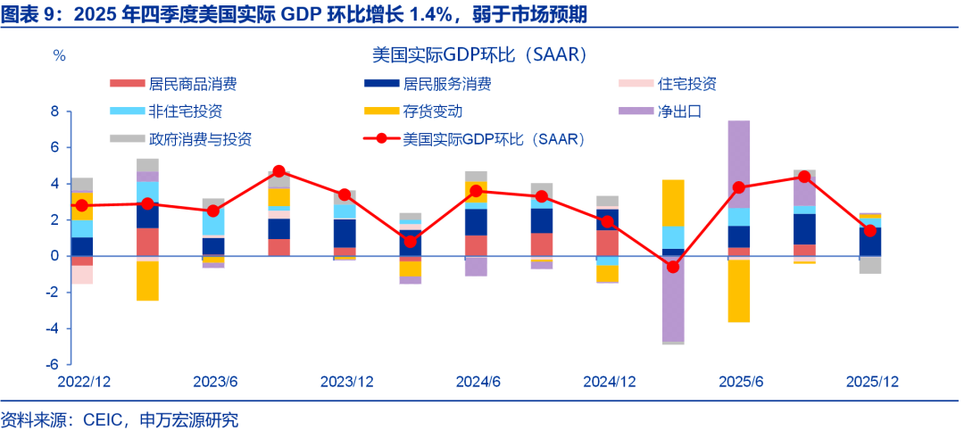 四季度美国GDP增速弱于预期,2025年全年经济增速仍达2.2%。美国2025年四季度实际GDP环比增长1.4%(年化),弱于市场3%的预期,也低于三季度的4.4%。根据数据公布前的亚特兰大联储GDPNow预测,可见此次数据低于预期的拖累主要来自政府消费及投资。但综合来看,2025年美国全年经济增速为2.2%,显著强于2025年初的市场预期。
