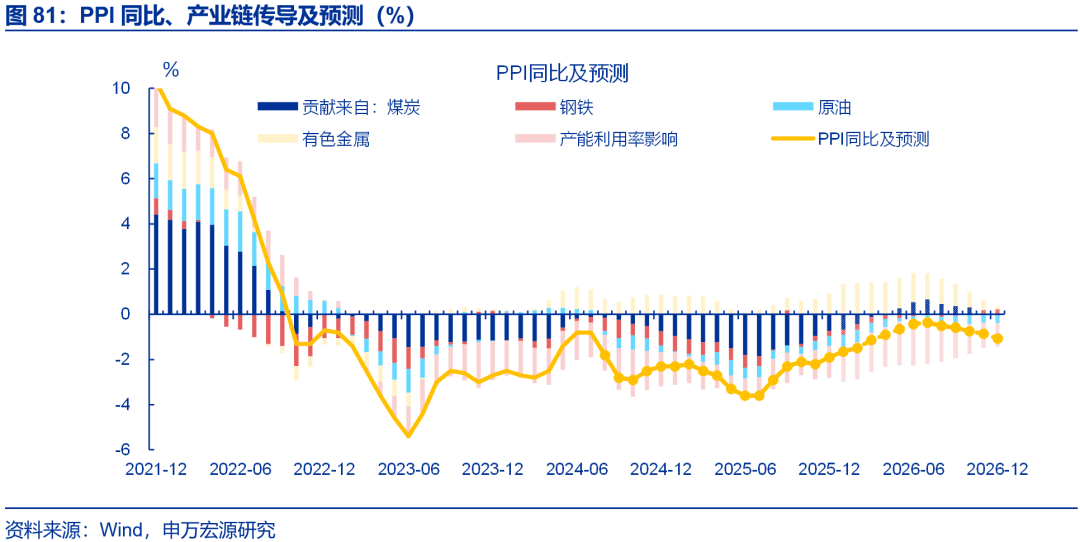 1月PPI降幅明显收窄,主因铜价对PPI的拉动进一步增加,基期轮换也有一定程度的影响。1月PPI环比0.4%,同比上行0.5pct至-1.4%。我国价格指数每五年进行一次基期轮换,2026年开始为新一轮基期轮换调整,测算本次基期轮换对每月PPI同比的影响平均约为0.08个百分点,总体较小。更重要的是,1月铜价涨幅进一步扩大(环比9.3%),相应有色采选、有色压延业价格环比分别5.7%、5.2%,拉动PPI环比0.5%,为最强贡献项。钢价对PPI贡献也为正,拉动PPI环比0.1%。