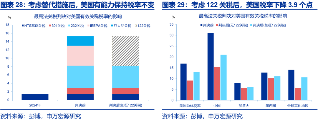 考虑122关税替代措施后,美国关税税率或仅下降3-4个百分点。对等关税失效后,特朗普随即启用122条款,在10%税率的情况下,美国有效税率或将下降3.9个百分点。但122条款失效后,若依赖232与301条款补足缺口,美国或需将301关税由中国扩大至多个主要贸易伙伴,将232关税覆盖范围进一步扩围。