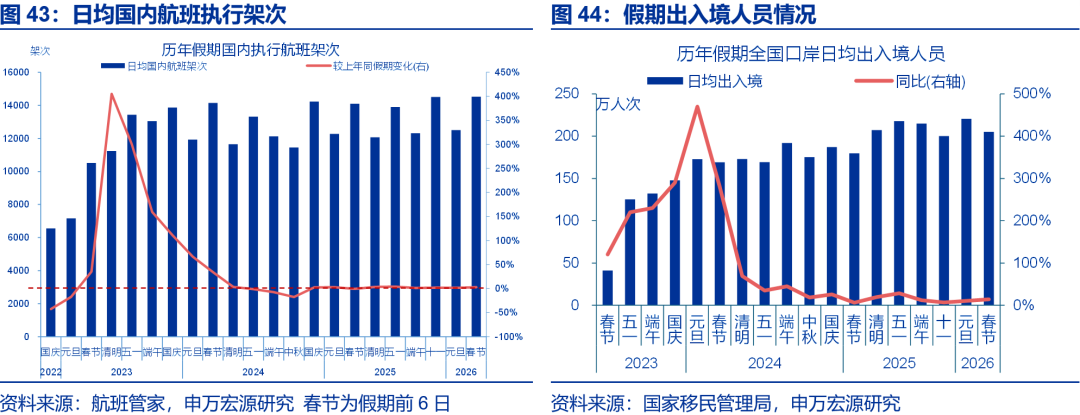 特征三:从执行航班架次看,国内执行航班架次延续上行,跨境出行热度则有回落。国内执行航班架次有所上行,春节假期第1-6日执飞航班数同比3%、较2025年十一假期上行1个百分点。相比之下,跨境出行热度有所回落,国家移民管理局预测,2025年春节假期全国口岸日均通关人数将达205万人次、较元旦假期回落7%。假期第1-6日,国际执行航班架次同比1.3%、较2025年十一假期回落9.1个百分点。其中,出境游热度回落较大,中国至日本、柬埔寨航班数同比分别较2025年十一假期回落70.4、50个百分点至-47.7%、-10%。入境游延续火热,去哪儿数据显示,春节假期首日(2月15日),使用非中国护照预订国内航班的数量同比增长近两成。