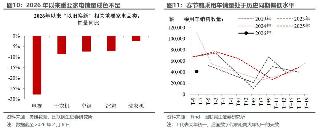 然而,并非所有领域都沐浴在“出行热”的暖阳之下,大宗消费相对“马力有限”。与出行端的“高热”形成对比,部分大宗与可选消费的复苏节奏仍显审慎分化。尽管625亿元的“以旧换新”资金已提前下达,但当前家电、汽车等品类销售仍显平缓,政策红利有待进一步释放。2026年以来重要家电销量成色不足,乘用车销量也处于历史同期偏低水平,反映居民在大件消费上的决策仍偏谨慎。