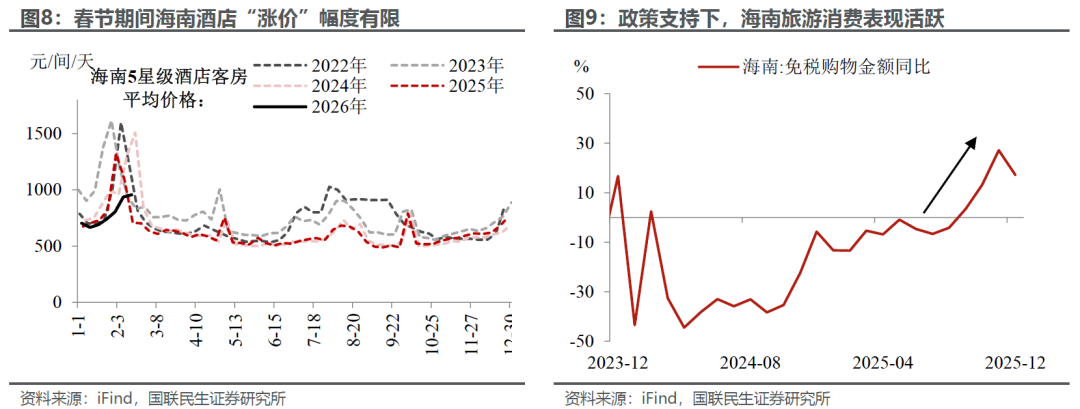 与此同时,政策托底正为消费潜力释放注入新动能。以海南为例,今年春节期间酒店客房价格实行市场调节与政府调控相结合的方式,严格落实明码实价要求,海南“涨价”幅度远小于往年同期,进一步提振了居民消费意愿。叠加免税政策持续放开,春节假期前四天海南离岛免税销售额达9.7亿元,同比增长15.8%,成为政策托底消费的鲜活样本。