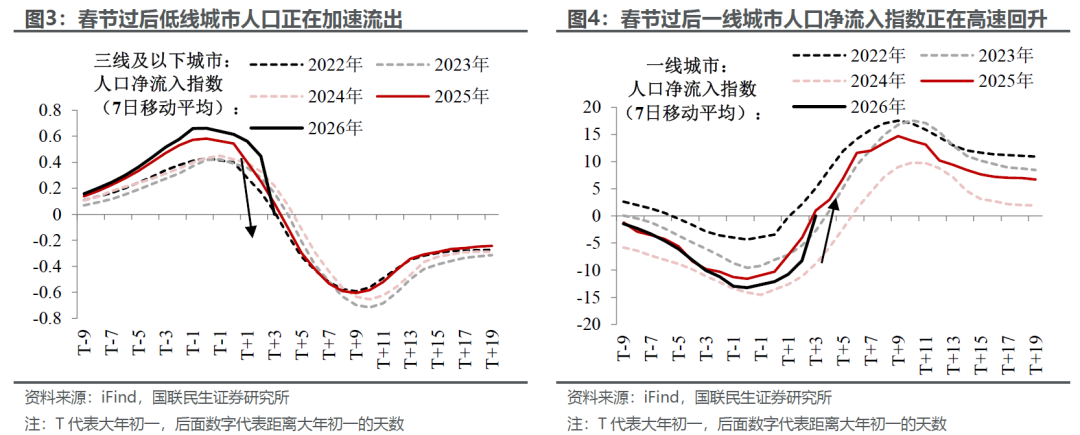 一是“提前返岗”趋势隐现,春节过后一线城市人口净流入指数加速回升,而低线城市人口流出加快,反映了今年春节时间偏晚的情况下,节后返工节奏相对前置;