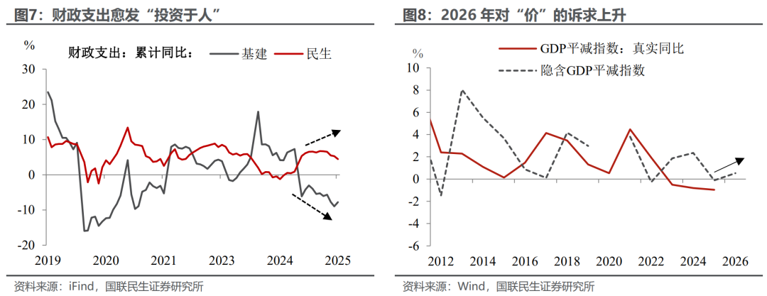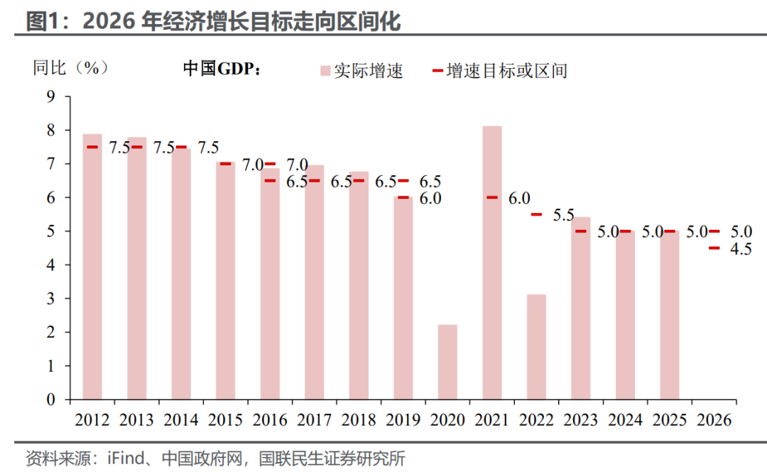 一是增长目标走向区间化,给出从“量”到“质”的最清晰信号。由以往的“5%左右”调整为“4.5%-5%”,表明通过接受增长的阶段性放缓,为高质量发展留出空间、为结构性改革腾出余地,让经济增速更加贴近潜在增长水平。透过赤字率目标,我们测算背后的隐含GDP平减指数为0-0.5%,相较于去年有所改善,说明2026年对“价”的诉求更高。