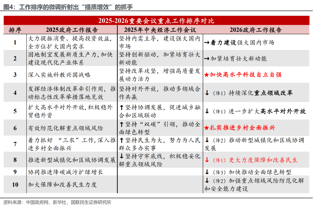 四是以民生改善夯实增长获得感。相较于去年12月的中央经济工作会议,“加大保障和改善民生力度”的次序前移,替代绿色发展成为更优先的工作安排。促进高质量充分就业、推动教育质量提升、强化医疗卫生服务等成为民生重点工作。