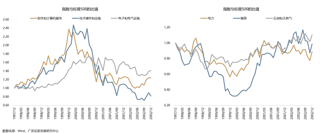 (3)但市场并没有马上终结对“金发女孩”叙事的定价。科索沃战争(99.3-99.6)->油价抬升->美联储加息(99.06-00.05)->经济受到抑制->科网泡沫破灭(00.03),这一过程并不是一蹴而就。事实上,自99年6月开始加息之后,纳指还涨了91%。特别是科网板块,自始至终都领跑市场。97-99年,纳指的年度涨幅21.6%、39.6%、85.6%。