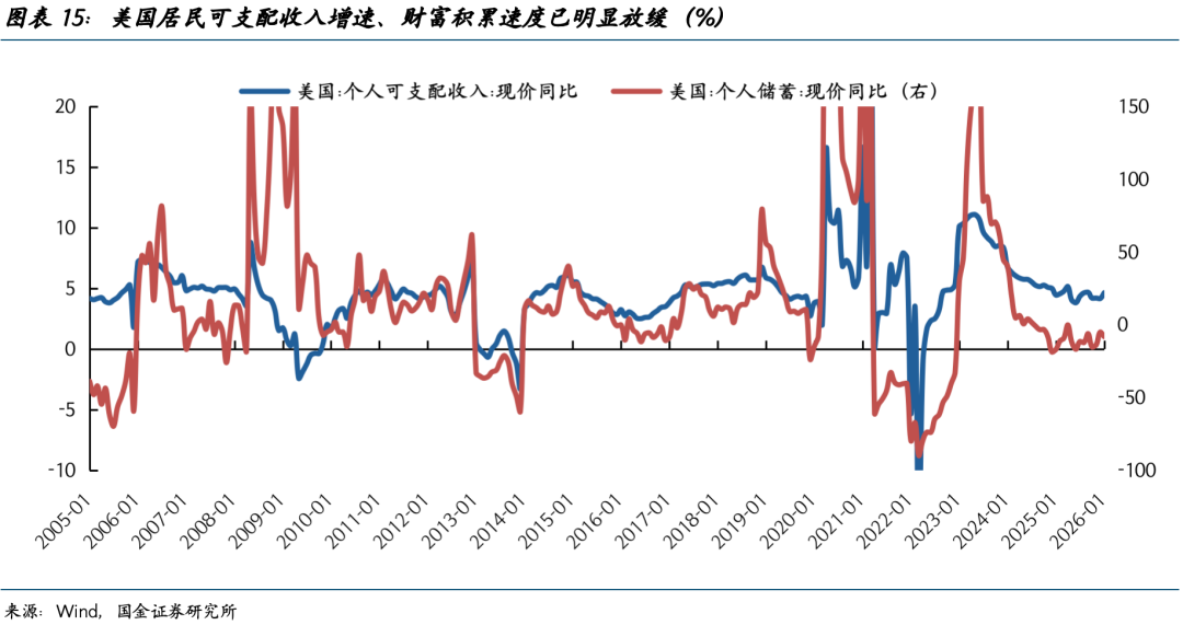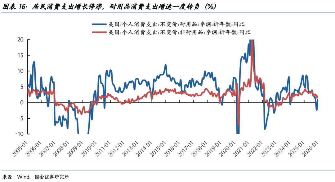 现如今,尽管有AI相关投资的支撑,但中下层居民的痛苦并不能被AI投资所掩盖。今年1月,美国私人耐用品消费支出增速回落至1%(图表15、16)。2025年前三季度,AI相关产业对实际GDP增长的贡献率达到37%,高于2024年同期水平,同期实际GDP增长率为2.1%,但若剔除AI产业贡献,仅为1.5%。