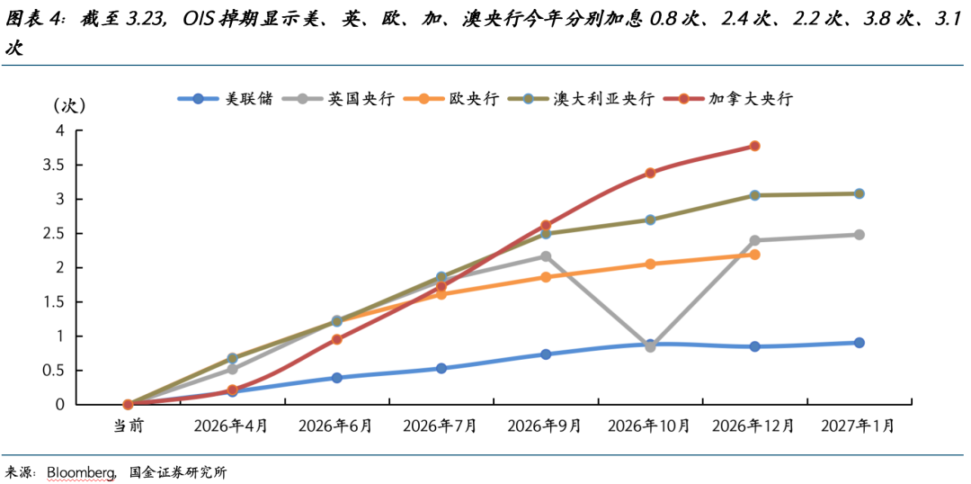 本轮金价调整,起初是美伊战争爆发,石油和美元大幅走强引发的流动性紧缩预期。美国作为第一大石油生产国和石油净出口国,油价上升让美元相较于非美货币被动地获得了溢价。同时,来自中东和亚洲市场的避险需求也让离岸美元流动性收紧。之后,油价持续高位引发输入性通胀担忧,央行和期货市场修正利率预期,截至3月23日,隔夜掉期市场开始定价美联储年内将加息0.8次,英、欧、加、澳央行今年将分别加息2.4次、2.2次、3.8次、3.1次(图表4)。美债利率的上移,让黄金的投机客迅速撤退(图表2、3)。