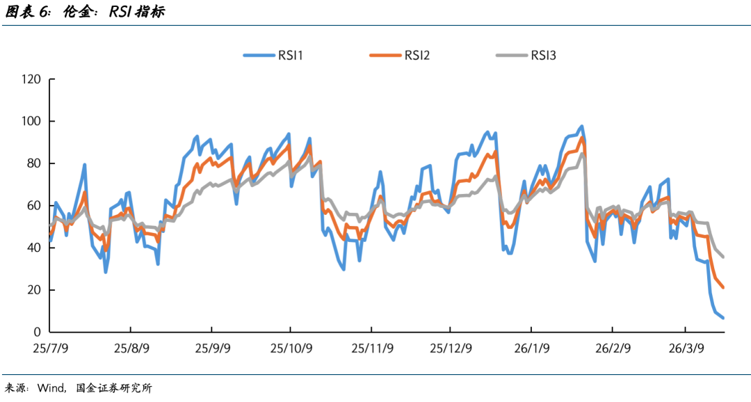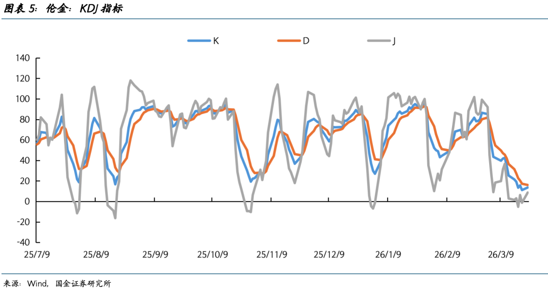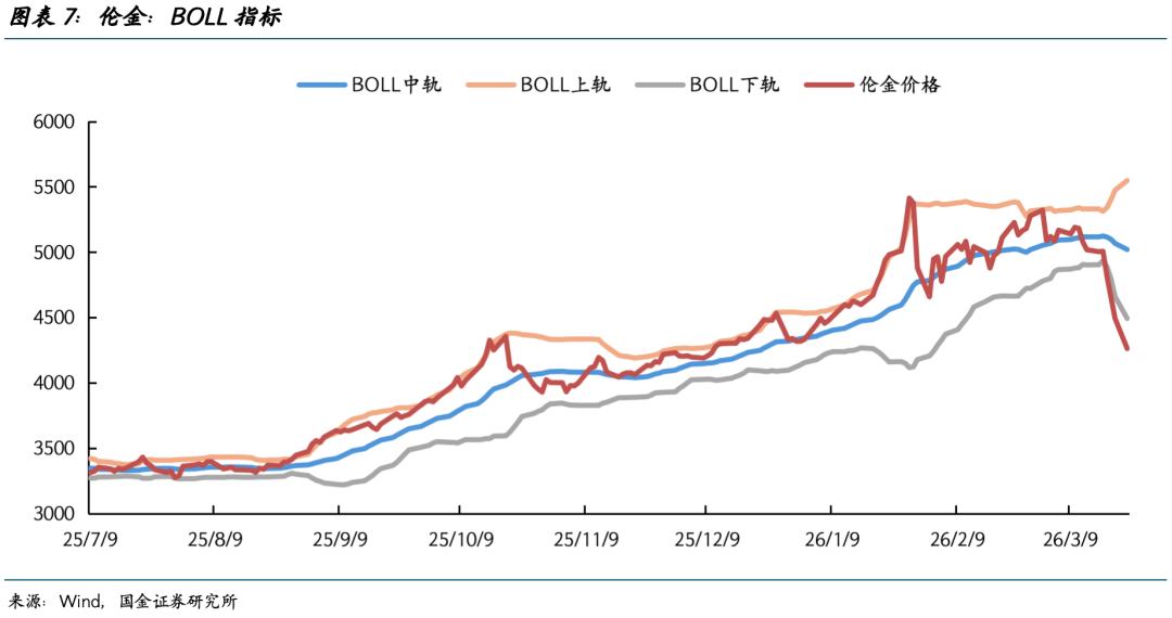 短期内,黄金大多技术性指标均已显示超卖,但反转趋势尚不明确。截至3月23日,伦金RSI已跌至21.1的极端值(图表6),但并未出现底背离信号;K、D、J值分别为13.6、16.0、8.7,但尚未出现黄金交叉信号(图表5);价格延BOLL线下轨继续下探,且轨道开口变宽,或标志新趋势的开始(图表7)。