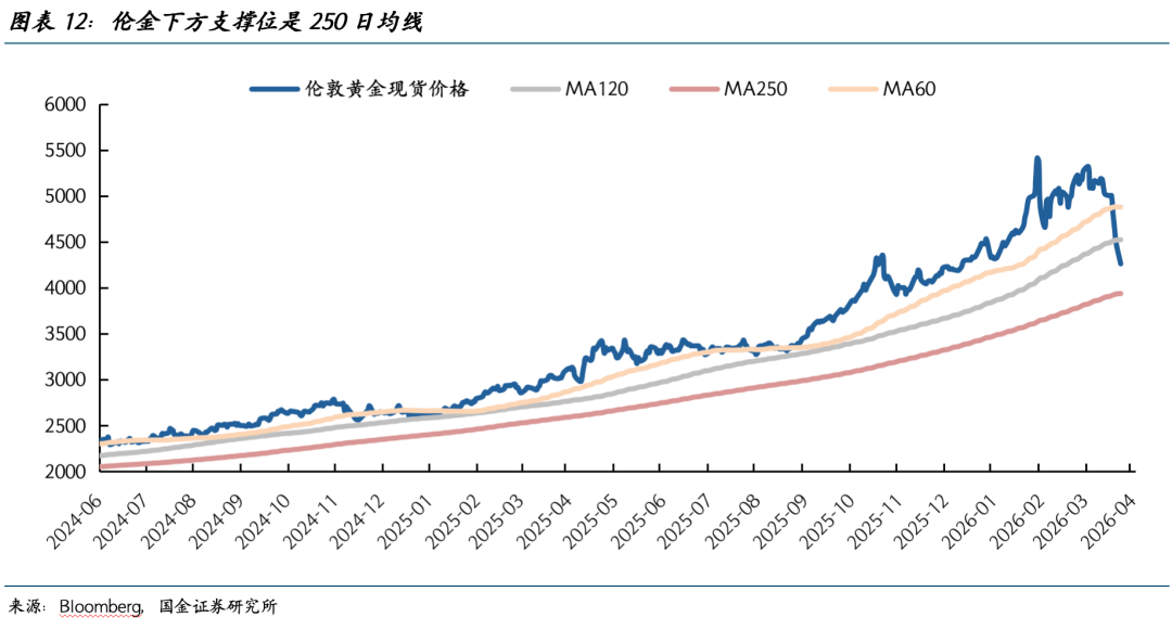 在4500点下方,4300点是今年金银阶段性冲高行情的起点,3900-4000点附近既是心理上的整数关口位,也是250日均线位,还是去年10月黄金回调时的支撑位(图表12)。在3900点下方,3400-3500点附近是去年8月鲍威尔货币政策转向的开始,也是本轮黄金开启主升浪的起点。
