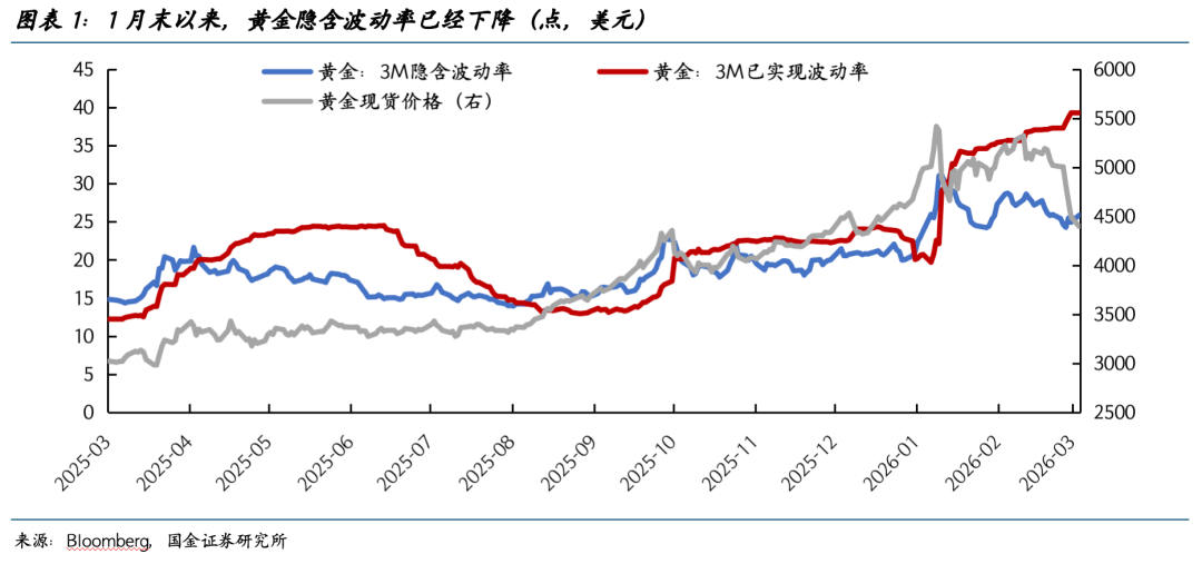 3月以来,黄金价格快速回调,不免让市场回忆起1月底的“沃什交易”,但1月底的调整是高拥挤度背景下,因远端缩表预期发酵导致的集中平仓。而本轮金价剧烈调整前,隐含波动率已脱离极端高点(图表1),宏观变量成为金价的主导。