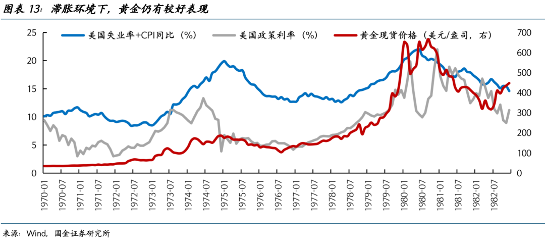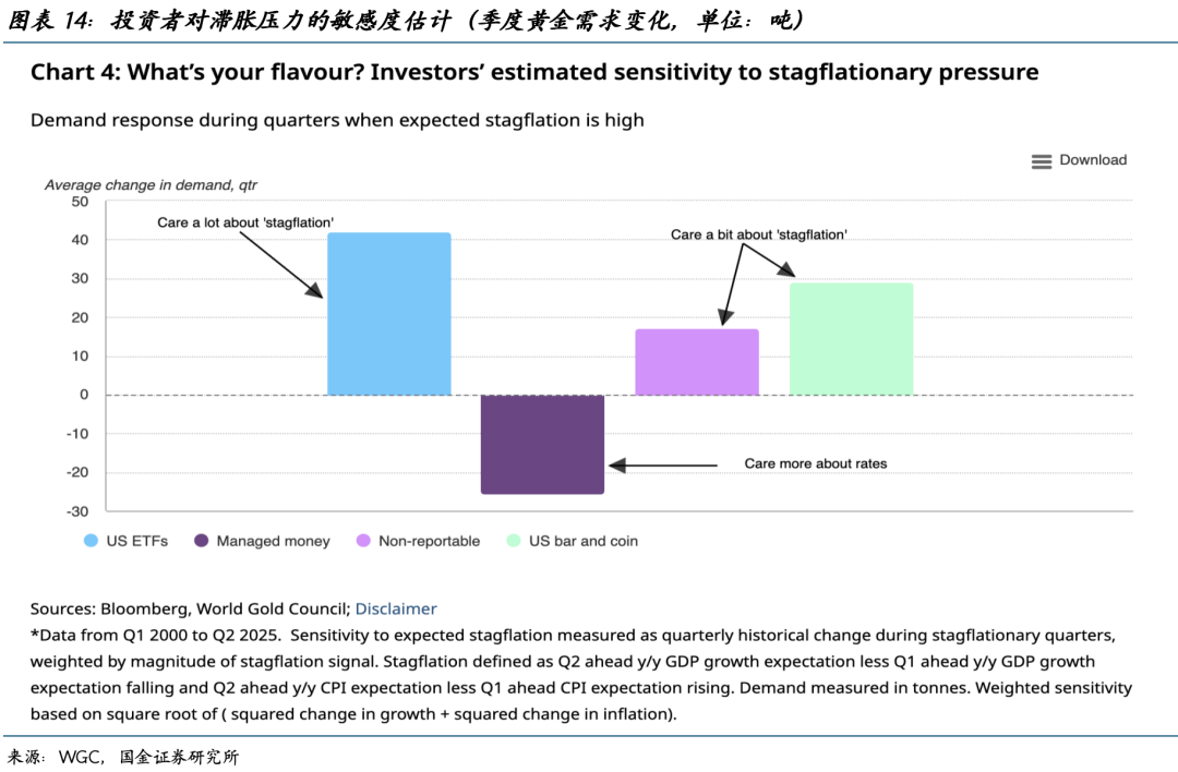 从上世纪70年代两次石油危机的经验来看,当经济陷入滞胀环境(高CPI增速+高失业率),即便政策利率相应抬升,黄金依然总体趋势上涨(图表13)。世界黄金协会的资金流数据统计也显示,当市场滞胀预期上升时,市场对于黄金的平均需求为正(图表14)。本轮市场在剧烈的预期修正中集中定价“涨”,却忽略了“滞”的压力,因此黄金阶段性出现了大幅回撤。