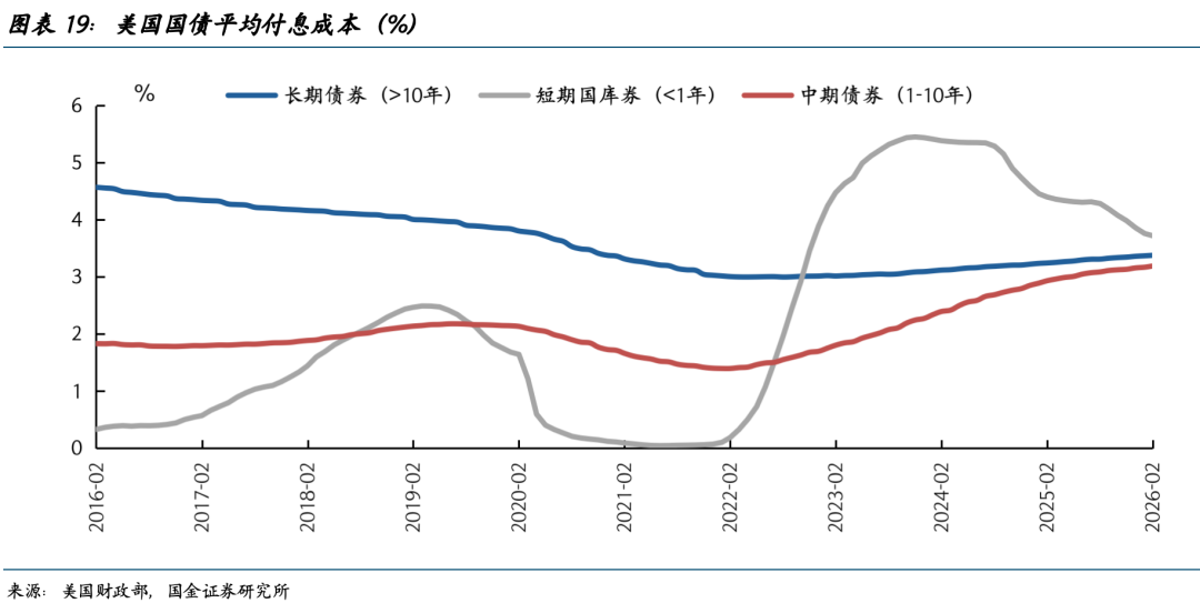 第三,利率上升还阻碍到特朗普第二任期的最核心议题——化债大计。截至2026年2月底,美国存量长期国债的平均付息成本为3.38%,较一年前上升了0.14个百分点,高利率的滞后效应仍在显现。若美国因战争扩大军事开支,进而加速财政失序扩张,美元信用的褪色终会被市场计价。