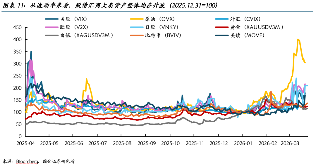 从跨资产的角度,黄金若能继续降波将重拾避险优势。3月以来,不仅是黄金,大类资产均朝着滞胀交易演绎,股票、债券波动率均在上升(图表11),现金资产的重要性不言而喻。但值得一提的是,过往高波动且对流动性极度敏感的资产代表——加密货币,本轮反而跌幅较小,或是因为之前经历了一轮降波行情,估值压力先一步释放。黄金在经历一段时间的降波行情后,或也能重新找回其“相对安全性”。