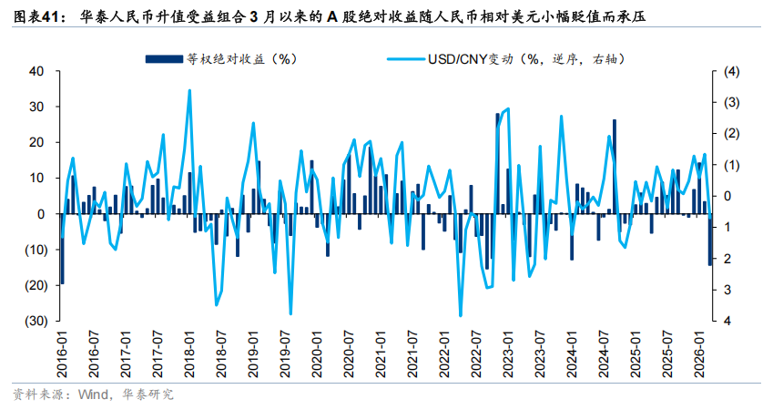 近期美元走强拖累,人民币相对美元出现了小幅贬值,但中期看人民币升值趋势不变,能源金属等升值受益品种可逢低吸筹。在美元指数走强的背景下,人民币近期相对美元小幅贬值,我们的人民币升值组合自3月以来承压。但从更长的视角看,我们认为,地缘风险和油价上行风险的冲击可能使得人民币升值的斜率放缓,但考虑到其相对中国的强贸易顺差仍被明显低估,中期的升值趋势不变。且目前的地缘冲突反而在中长期视角进一步加速去美元化和人民币国际化的趋势(《中东局势如何影响香港资本市场重估》,2026/3/28)。因此,对于AH有色、A股部分中游材料和制造(如电池等)以及香港本地股等人民币升值期间表现较好的受益品种,仍有逢低吸筹机会。