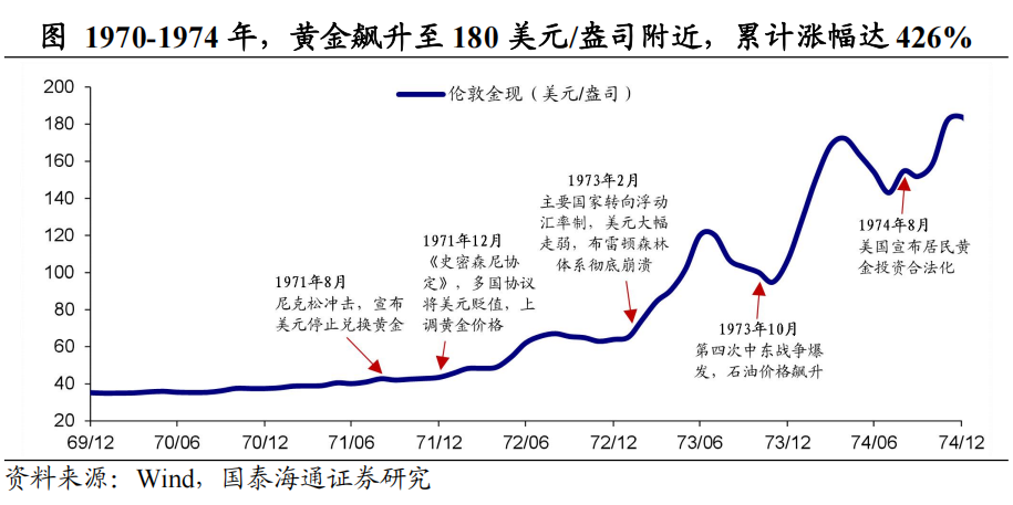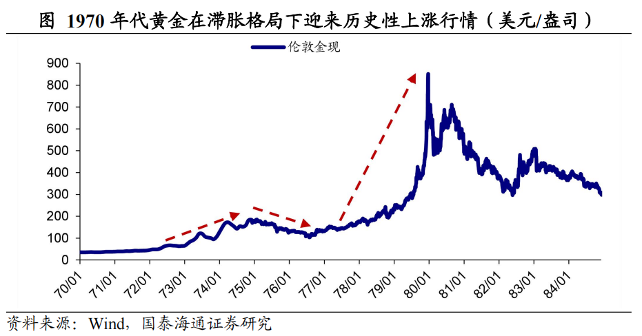 1970-1974:黄金的初升浪。1970年代黄金牛市序幕的开启,主要是受货币体系重构、通胀预期失控、投机情绪等因素影响。第一,布雷顿森林体系的瓦解使得美元持续走弱,黄金开启了自由定价的时代。第二,在内部货币政策过于宽松以及地缘冲突带来的石油危机影响下,美国通胀预期失控削弱了货币的购买力,使得黄金作为保值工具需求大增。第三,美国黄金投资合法化催生了投机需求,大量的投机资金在1974年下半年提前建仓,将金价在禁令解除前推高至局部历史高点。