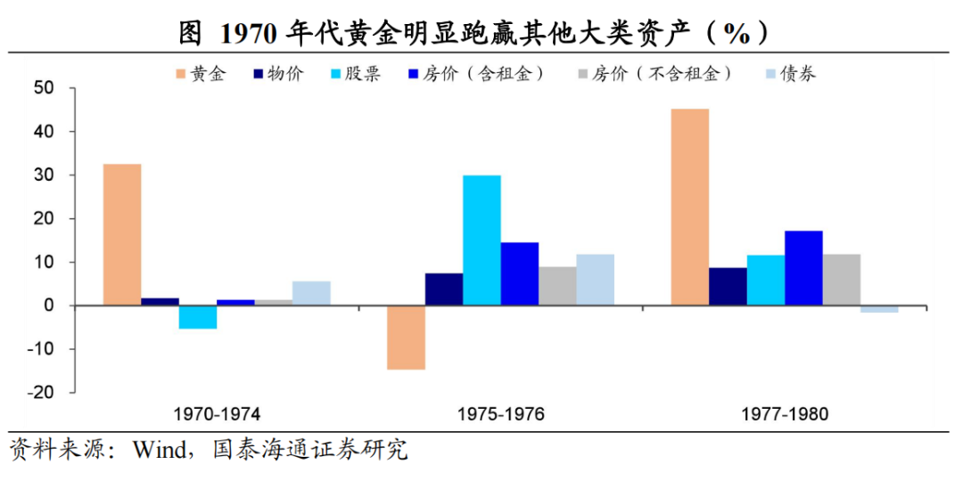 经验一:滞胀时代下,黄金是最好的投资选择。从1970年代的经验可以看出,在经济增长停滞与物价高涨并存的“滞胀”格局中,传统股债资产往往表现不佳。一方面,股票价格会因无风险利率上行和盈利能力受限而承压;另一方面,债券也会因利率快速上行导致的折价以及高通胀对票息价值的侵蚀而陷入亏损。而黄金在通胀预期失控以及法币面临信任危机时,具有较高的保值与避险价值。在1970-1974年,以及1977-1980年期间,黄金年化收益率分别达到32.5%和45.2%,明显跑赢其他资产,成为“滞胀”时期中最具价值的投资选择。