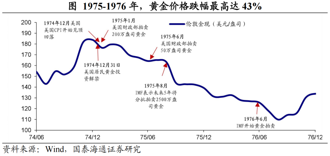 黄金狂热的上涨势头在1975年迎来了“急刹车”。在触及了1974年12月底的184美元/盎司的高点之后,金价步入了近两年的熊市,最终在1976年8月底触及103.5美元/盎司的谷底,跌幅达43%。具体来看,这场深度回调是宏观基本面改善、政策干预、以及投机情绪降温的共同产物。