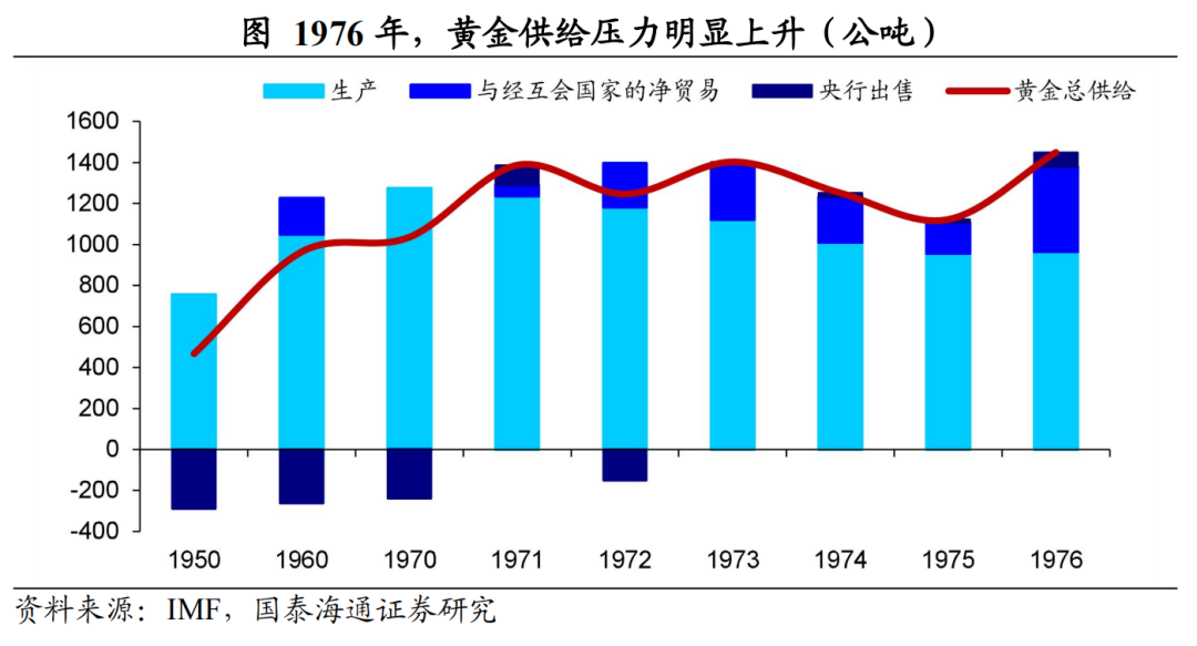除了美国财政部与IMF之外,苏联由于国内农业歉收,被迫在1976年出售大量黄金筹集资金来购买谷物。这一“刚性抛售”也显著增加了当时全球黄金总供给规模,增加了黄金价格的不稳定性。