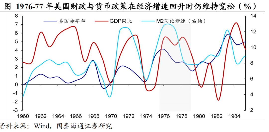内部来看,美国过于宽松的财政与货币政策成为了通胀卷土重来的温床。 1976 年底,美国 CPI 同比回落至 5% 左右,这一数据使得当时的宏观决策者认为通胀已被成功遏制。