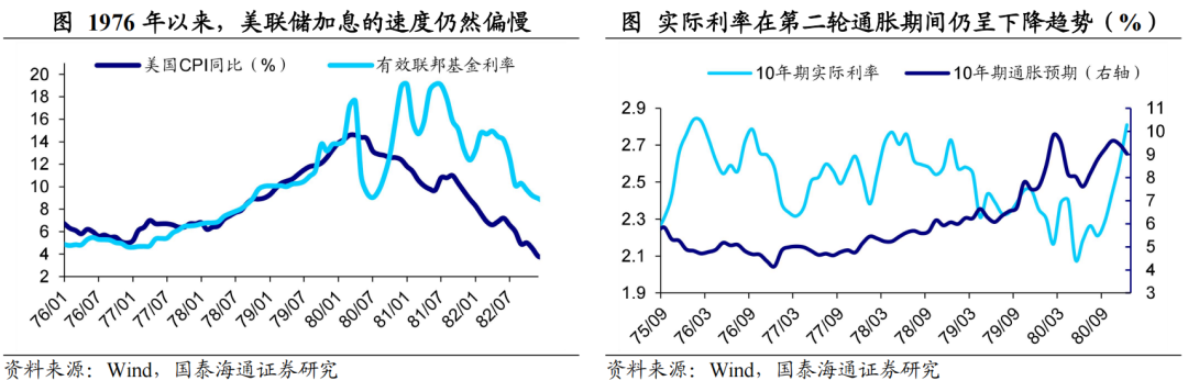 在此期间,即便美联储为了抑制通胀不断加息,有效联邦基金利率从 1977 年初的 4.6% 上升至 1980 年初的 13.8% ,但由于通胀预期的失控,实际利率并没有因加息回升,反而呈下降趋势。