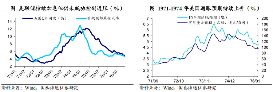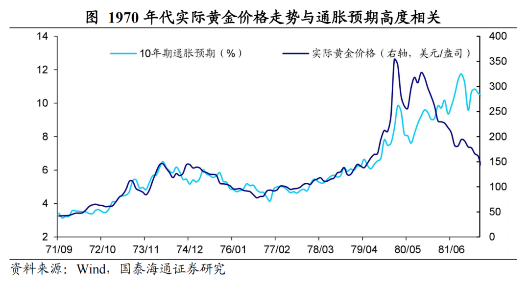 经验二:决定黄金价格的核心并非通胀本身,而是通胀预期与名义利率之间的相对速度,即实际利率。 1970 年代黄金能够随通胀一同上涨,关键在于市场丧失了对美联储管控通胀能力的信心,通胀预期失控。在此情况下,即便美联储持续加息,但因加息的速度偏慢,使得实际利率在通胀预期失控的情况下反而不断下行。因此,黄金不仅能在通胀飙升的情况下受益于抗通胀属性,也能在实际利率下行的情况下降低自身的持有成本。