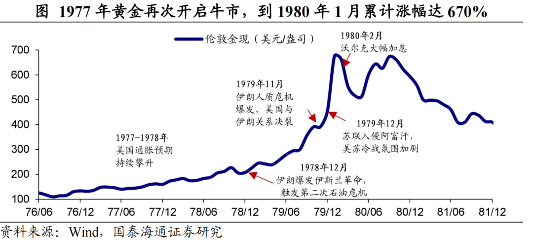 虽然1976年市场主流观点对黄金的判断较为悲观,但黄金价格却在1976年8月触底后开启了第二阶段的猛烈上涨,在不到三年半的时间里从110美元/盎司飙升至1980年1月850美元/盎司,区间累计涨幅达到670%。究其原因,卷土重来的恶性通胀、频发的地缘黑天鹅以及法币信仰的崩溃均是黄金再次上涨的重要推手。
