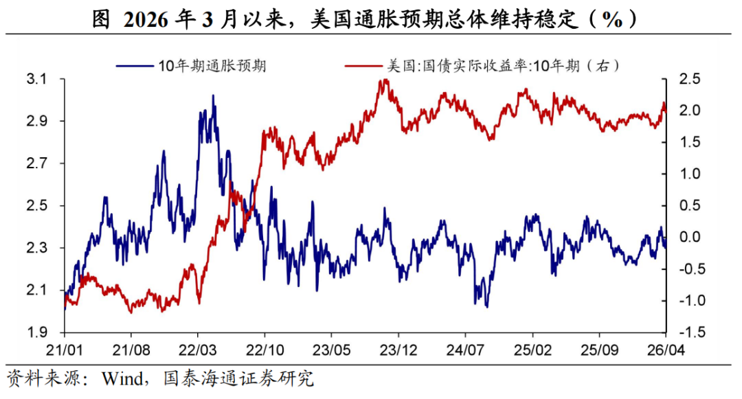 2026 年 3 月以来,市场担忧油价高企会使得全球央行货币政策收紧,在通胀预期维持稳定的情况下,这一担忧带动了实际利率的持续上行,因此给黄金带来了较大的下跌压力。
