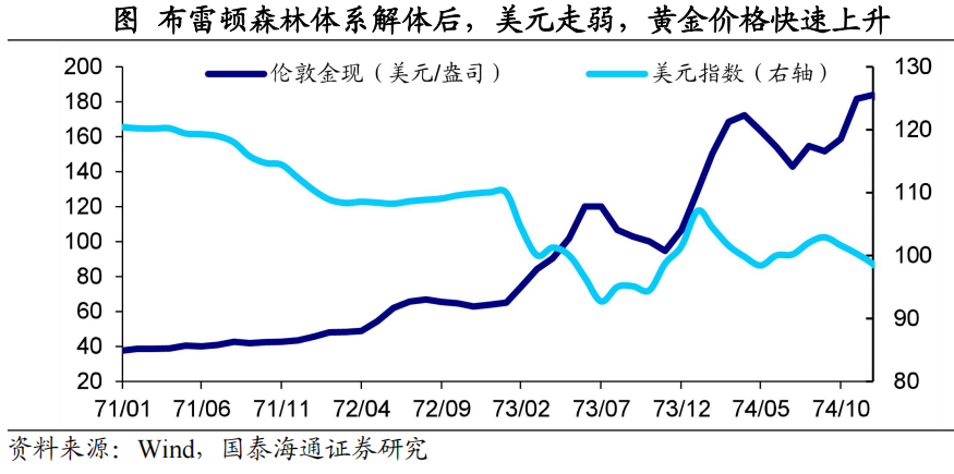 第一,布雷顿森林体系的瓦解使得美元持续走弱,黄金开启了自由定价的时代。1960年代后,随着美国深陷越南战争泥潭以及福利支出的急剧膨胀,其财政赤字与国际收支逆差不断扩大。大量美元流向海外,导致外国中央银行手中积累的美元债权远超美国黄金储备。欧洲国家频频要求将美元兑换成黄金,美国黄金储备面临枯竭的危机。1971年8月13日,尼克松宣布暂停向外国央行兑换黄金,标志着布雷顿森林体系的解体。失去了黄金背书的美元面临严重的信用危机,市场对法定货币的信任度急剧下降,美元指数从1971年初的160下降至1973年的92附近。相比之下,黄金价格快速上升,迎来了自由定价的时代。